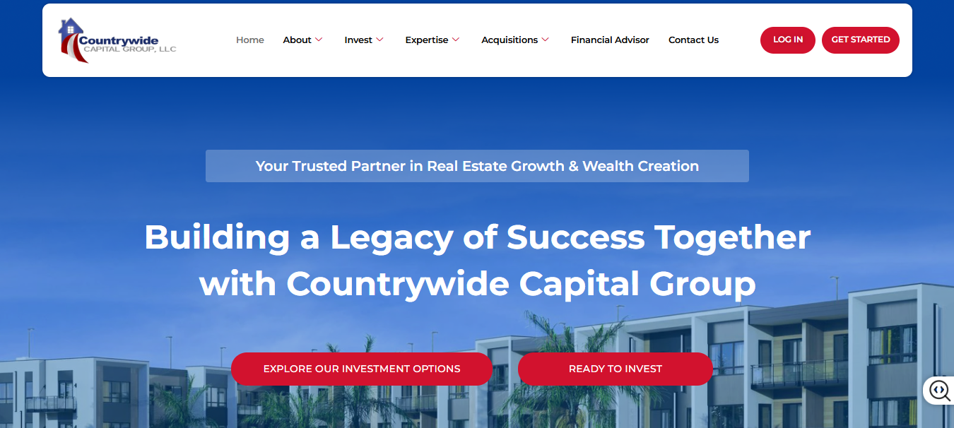 Real estate website with visually appealing layout and branding, including graphic elements for marketing properties.